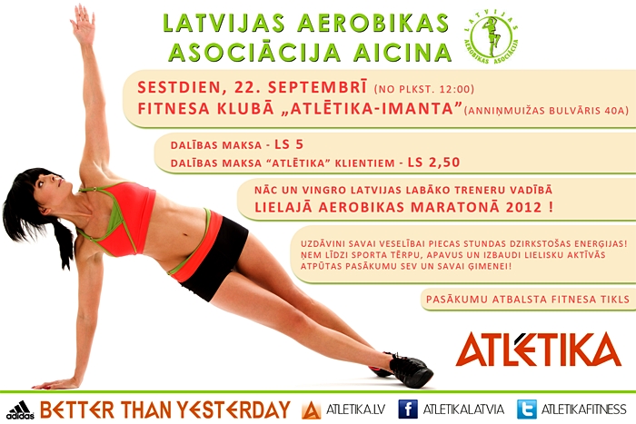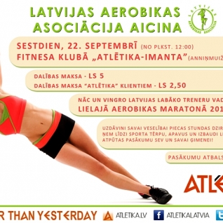 Aerobikas maratonā piedalīties mīļi aicināts ikviens! Šī pasākuma moto ir - pavadām aktīvu un iedvesmojošu sestdienu kopā ar Latvijas labākajiem treneriem. Tā ir Jūsu iespēja baudīt dzirkstošu dzīvesprieku un uzlādēt savas enerģijas baterijas, iepazīstot daudz un dažādus aerobikas un deju veidus, kurus Jūs varbūt nemaz citādi ikdienā nepamēģinātu.